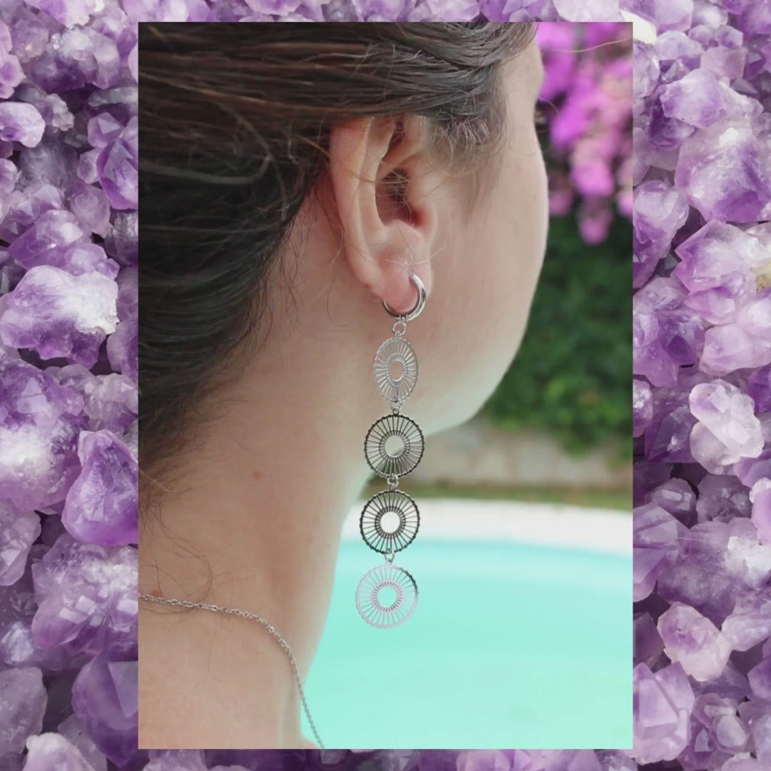 Long earrings made up of little plates joined together.